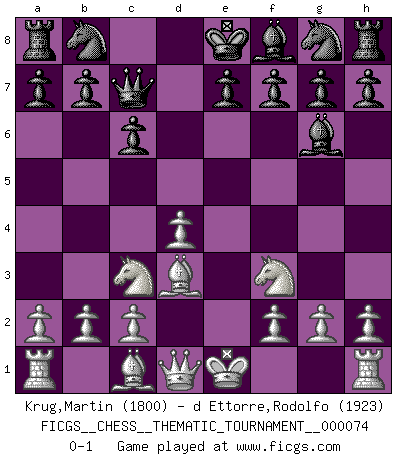 Last move : 0-1 2009 April 1 1:39:39 [Event "FICGS__CHESS__THEMATIC_TOURNAMENT__000074"] [Site "FICGS"] [Date "2009.02.18"] [Round "1"] [White "Krug,Martin"] [Black "d Ettorre,Rodolfo"] [Result "0-1"] [WhiteElo "1800"] [BlackElo "1923"] 1.e4 d5 2.exd5 Qxd5 3.Nc3 Qe5+ 4.Be2 c6 5.Nf3 Qc7 6.d4 Bf5 7.Bd3 Bg6 0-1 This chess game has been lost on time (started : 2009.02.18 3:43:7) Scandinavian (centre counter) defense Player Black won this chess game. Follow this game move after move (download)Robert Fischer is a law unto himself. (Larry Evans) Wenn Schach ein enormer Dschungel ist, der seine Myriaden von Geheimnissen nicht preisgeben will, dann sind Computer die Kettensägen einer gewaltigen ökologisch unsensiblen Nutzholzfirma. (Nigel Short) Si yo gano un torneo, yo lo gano por mí mismo. Yo hago las jugadas. Nadie me ayuda. (Bobby Fischer) Karpov est une pièce de musée. (Garry Kasparov) For a mechanic, you seem to do an excessive amount of thinking. (C-3PO in Star Wars ep.2)