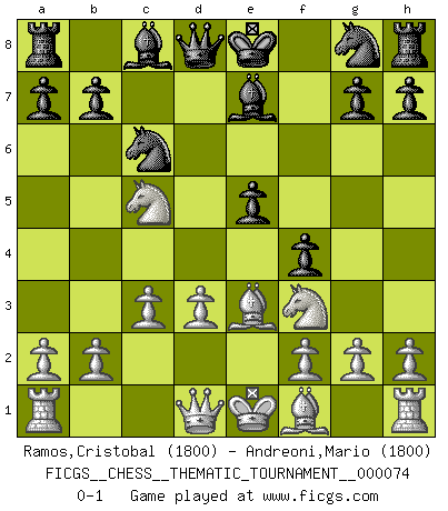 Last move : 0-1 2009 April 7 14:14:37 [Event "FICGS__CHESS__THEMATIC_TOURNAMENT__000074"] [Site "FICGS"] [Date "2009.02.18"] [Round "1"] [White "Ramos,Cristobal"] [Black "Andreoni,Mario"] [Result "0-1"] [WhiteElo "1800"] [BlackElo "1800"] 1.e4 d5 2.Nc3 dxe4 3.Nxe4 e5 4.Nf3 c5 5.c3 Nc6 6.d3 Be7 7.Be3 f5 8.Nxc5 f4 0-1 This chess game has been lost on time (started : 2009.02.18 3:43:7) Scandinavian (centre counter) defense Player Black won this chess game. Follow this game move after move (download)You can only get good at Chess if you love the game. (Bobby Fischer) Wenn ich Weiß habe gewinne ich weil ich Weiß habe, wenn ich Schwarz habe gewinne ich weil ich Bogoljubov bin. (Efim Bogoljubov) Fischer es el jugador mas fuerte del mundo. De hecho, el jugador mas fuerte que jamas haya existido. (Larry Evans) Même si vous avez un bon coup à faire, regardez toujours s'il n'y en a pas un qui lui soit préférable. (Pedro Damiano) CHESS, n. f. [echecs, Fr.] A nice and abstruse game, in which two sets of puppets are moved in opposition to each other. (Dr Samuel Johnson, A Dictionary Of The English Language, 1755)