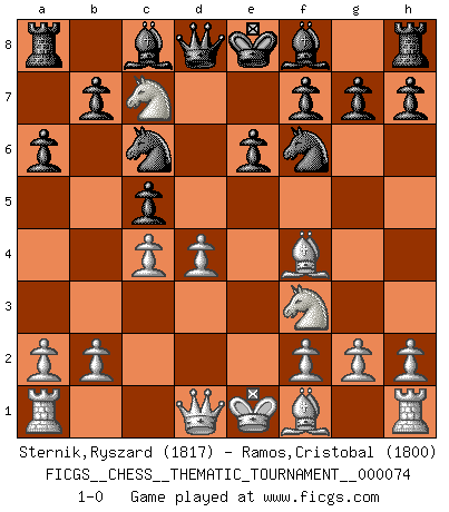 Last move : 1-0 2009 March 15 22:4:52 [Event "FICGS__CHESS__THEMATIC_TOURNAMENT__000074"] [Site "FICGS"] [Date "2009.02.18"] [Round "1"] [White "Sternik,Ryszard"] [Black "Ramos,Cristobal"] [Result "1-0"] [WhiteElo "1817"] [BlackElo "1800"] 1.e4 d5 2.exd5 Nf6 3.d4 Nxd5 4.c4 Nf6 5.Nc3 e6 6.Nf3 c5 7.Bf4 Nc6 8.Nb5 a6 9.Nc7+ 1-0 Scandinavian : Marshall variation Player White won this chess game. Follow this game move after move (download)We must make sure that Chess will not be like a dead language, very interesting, but for a very small group. (Sytze Faber) Kein Großmeister ist normal. Sie unterscheiden sich nur im Ausmaß Ihrer Verrücktheit. (Viktor Kortschnoi) No es suficiente ser un buen jugador, se debe también de jugar bién. (Siegbert Tarrasch) Les écrivains ont utilisé les échecs pour analyser les côtés extrêmes de la nature humaine. Dans ce cadre, les échecs offrent un champ d'expérimentation idéal. Mais on pourrait faire la même chose avec la peinture. Et là, en vous référant à Van Gogh, vous ne tirerez pas de conclusion définitive sur les peintres. (Gary Kasparov) Life is like a game of cards: the hand you are dealt represents determinism; the way you play it is free will. (Jawaharlal Nehru)