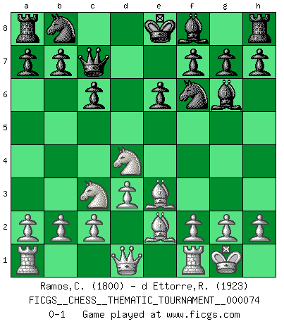 Last move : 0-1 2009 April 1 13:40:4 [Event "FICGS__CHESS__THEMATIC_TOURNAMENT__000074"] [Site "FICGS"] [Date "2009.02.18"] [Round "1"] [White "Ramos,Cristobal"] [Black "d Ettorre,Rodolfo"] [Result "0-1"] [WhiteElo "1800"] [BlackElo "1923"] 1.e4 d5 2.exd5 Qxd5 3.Nc3 Qe5+ 4.Be2 c6 5.Nf3 Qc7 6.O-O Bf5 7.d3 e6 8.Be3 Nf6 9.Nd4 Bg6 0-1 This chess game has been lost on time (started : 2009.02.18 3:43:7) Scandinavian (centre counter) defense Kingside Castling by player White (move 6) Player Black won this chess game. Follow this game move after move (download)Chess is a beautiful mistress. (Bent Larsen) Je älter ich werde, um so mehr schätze ich die Bauern. (Paul Keres) La señal de un Gran Maestro es su habilidad de ganar una partida rápidamente y sin dolor. (Irving Chernev) RxDa4 pat (...) Wisdom doesn't necessarily come with age. Sometimes age just shows up all by itself. (Tom Wilson)