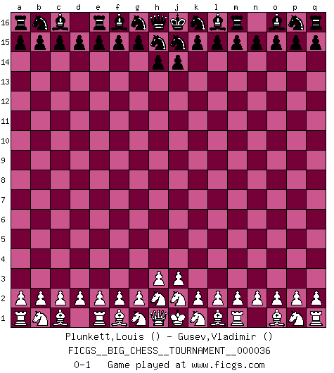 Last move : 0-1 2009 March 20 23:26:23 [Event "FICGS__BIG_CHESS__TOURNAMENT__000036"] [Site "FICGS"] [Date "2009.02.18"] [Round "1"] [White "Plunkett,Louis"] [Black "Gusev,Vladimir"] [Result "0-1"] [WhiteElo ""] [BlackElo ""] 0-1 This big chess game has been lost on time (started : 2009.02.18 21:43:16) Follow this game move after move (download)Fischer is the strongest player in the world. In fact, the strongest player who ever lived. (Larry Evans) Wie bekannt hörte Morphy 1859 auf, Schach zu spielen. Seine Enttäuschung galt nicht so sehr dem Schach, wie den Schachspielern. (Robert James Fischer) La pasion por jugar al Ajedrez es una de las mas inexplicables en el mundo. (H.G. Wells) 'L'échange des dames est un coup dur pour les deux adversaires...' Un journaliste lors d'une partie du match Spassky-Fischer Be who you are, and say what you feel because those who mind don't matter, and those who matter don't mind. (Dr Seuss)