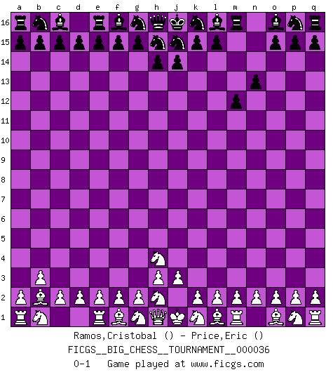 Last move : 0-1 2009 March 6 2:41:34 [Event "FICGS__BIG_CHESS__TOURNAMENT__000036"] [Site "FICGS"] [Date "2009.02.18"] [Round "1"] [White "Ramos,Cristobal"] [Black "Price,Eric"] [Result "0-1"] [WhiteElo ""] [BlackElo ""] 1.b2-b3 m15-m13 2.c1-b2 m13-m12 3.j2-h4 n15-n13 0-1 Follow this game move after move (download)Morphy was probably the greatest genius of them all. (Bobby Fischer) Schach verlangt totale Konzentration. (Robert James Fischer) Tu sabes que vas a perder. Aún cuando tenía la ventaja, yo sabía que iba a perder. - al estar jugando con Fischer (Andrew Soltis) Avec des compensations pour le matériel en plus... (Anonyme) All battles are fought by scared men who'd rather be someplace else. (John Wayne in the movie In harm's way)