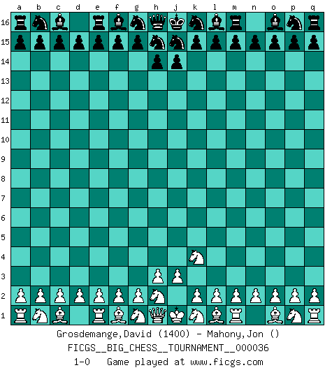 Last move : 1-0 2009 March 20 23:26:23 [Event "FICGS__BIG_CHESS__TOURNAMENT__000036"] [Site "FICGS"] [Date "2009.02.18"] [Round "1"] [White "Grosdemange,David"] [Black "Mahony,Jon"] [Result "1-0"] [WhiteElo "1400"] [BlackElo ""] 1.j2-k4 1-0 This big chess game has been lost on time (started : 2009.02.18 21:43:16) Follow this game move after move (download)Pawns are born free, yet they are everywhere in chains. (Rick Kennedy) Dass jemand wie Surab Asmaiparaschwili, der selbst Elopunkte gekauft hat , Vize-Präsident der Fide werden konnte, sagt schon einges über den Zustand dieser Organisation aus. (Joel Lautier) Una de estas pequeñas movidas modestas pudieran ser mas molestas a tu oponente que la amenaza mas grande. (Siegbert Tarrasch) L'action d'une oeuvre littéraire se déroule sur un champ de bataille. Les masques et les types du drame moderne correspondent aux pièces du jeu d'échecs. L'intrigue correspond aux coups et aux gambits, c'est à dire aux techniques du jeu telles qu'utilisées et interprétées par les joueurs. Les tactiques et les péripéties [mouvements] correspondent aux coups exécutés par l'adversaire. (Viktor Shklovsky) Somewhere in the world there is an epigram for every dilemma. (Hendrik Willem van Loon)