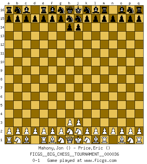 Last move : 0-1 2009 March 20 23:26:23 [Event "FICGS__BIG_CHESS__TOURNAMENT__000036"] [Site "FICGS"] [Date "2009.02.18"] [Round "1"] [White "Mahony,Jon"] [Black "Price,Eric"] [Result "0-1"] [WhiteElo ""] [BlackElo ""] 0-1 This big chess game has been lost on time (started : 2009.02.18 21:43:16) Follow this game move after move (download)A Chess game is divided into three stages: the first, when you hope you have the advantage, the second when you believe you have an advantage, and the third... when you know you're going to lose ! (Savielly Tartakower) Wenn du gegen Bobby spielst, ist es keine Frage von gewinnen oder verlieren. Es ist eine Frage des Überlebens. (Boris Vassilievich Spassky) Mis oponentes también hacen buenas movidas. A veces yo no tomo esas cosas en consideración. (Bobby Fischer) Pour se monter efficace, un Cavalier a besoin d'avant-postes ! Les Cavaliers font les meilleurs bloqueurs de pions passés. The real voyage of discovery consists not in seeking new lands but in seeing with new eyes. (Marcel Proust)