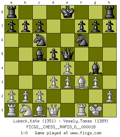 Last move : 1-0 2009 April 2 13:48:7 [Event "FICGS__CHESS__RAPID_D__000018"] [Site "FICGS"] [Date "2009.02.19"] [Round "1"] [White "Lubeck,Kate"] [Black "Vesely,Tomas"] [Result "1-0"] [WhiteElo "1351"] [BlackElo "1389"] 1.g3 d5 2.Bg2 e5 3.Nf3 e4 4.Ng5 Qxg5 5.d3 Nf6 6.O-O Qe5 7.f3 Nc6 8.fxe4 Bc5+ 9.e3 Bg4 10.Bf3 1-0 This chess game has been lost on time (started : 2009.02.19 13:30:27) Benko's Opening Kingside Castling by player White (move 6) Player White won this chess game. Follow this game move after move (download)You have to have the fighting spirit. You have to force moves and take chances. (Bobby Fischer) Kleine Schachspieler machen Mist, und große Schachspieler machen Mist, aber große machen weniger Mist. (Fritz Sämisch) Cuando veas una buena jugada, trata de encontrar otra mejor. (Emanuel Lasker) Dans le domaine de la peinture, de la gravure et de la sculpture, dès la première décennie de notre siècle, les artistes abandonnent la représentation de la partie d'échecs pour se concentrer sur les pièces, sur les échiquiers et sur toutes les variations auxquelles les unes et les autres peuvent donner lieu. On passe en quelque sorte d'un thème social à un thème musical (au sens de la musica médiévale, c'est-à-dire d'une notion qui inclue le rythme, l'harmonie, la construction et la déconstruction, etc.). Graphiquement et picturalement, l'échiquier apparaît comme une structure ouverte, dynamique, d'une richesse infinie, autorisant toutes les combinatoires et débouchant sur des mouvements et des rythmes de nature exponentielle. (Michel Pastoureau) Macintosh - we might not get everything right, but at least we knew the century was going to end. (Douglas Adams)