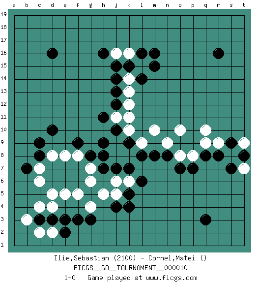 Last move : 1-0 2006 October 14 18:25:25 [Event "FICGS__GO__TOURNAMENT__000010"] [Site "FICGS"] [Date "2006.09.01"] [Round "1"] [Black "Ilie,Sebastian"] [White "Cornel,Matei"] [Result "1-0"] [Rating 1 "2100"] 1.r16 c4 2.q3 m10 3.d16 k16 4.d10 d5 5.k4 q10 6.q8 o10 7.n8 n9 8.m8 o8 9.o7 p8 10.p7 q9 11.r8 r9 12.m16 l9 13.l8 k8 14.k7 j8 15.j7 f5 16.f3 g4 17.g3 e5 18.d3 h5 19.j4 j5 20.k5 j6 21.h7 k6 22.l6 g7 23.h8 g6 24.g8 s8 25.s7 t7 26.s9 t9 27.t8 c2 28.c3 d2 29.e2 b3 30.j10 j9 31.h9 k10 32.k9 d4 33.e3 k11 34.h16 j11 35.h11 f8 36.f9 e8 37.c8 c7 38.b7 d8 39.c9 c6 40.j12 k12 41.j13 k13 42.j14 k14 43.j15 j16 44.k15 l15 45.l16 pass 46.m15 pass 47.l14 1-0 Here are the names of the openings (joseki) played in the four corners : Player Black won this Go (weiqi, baduk) game. Follow this game move after move (download)With only one group, you will win. (Anonymous) God is an atheist. (Unknown)