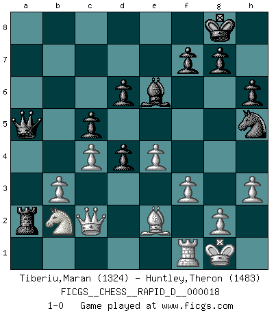Last move : 1-0 2009 March 13 23:7:13 [Event "FICGS__CHESS__RAPID_D__000018"] [Site "FICGS"] [Date "2009.02.19"] [Round "1"] [White "Tiberiu,Maran"] [Black "Huntley,Theron"] [Result "1-0"] [WhiteElo "1324"] [BlackElo "1483"] 1.e4 e5 2.d3 Nf6 3.Nf3 Nc6 4.c4 Bc5 5.h3 O-O 6.Be2 h6 7.O-O d6 8.Nc3 Nd4 9.Nxd4 Bxd4 10.Qb3 c6 11.Nd1 Qc7 12.Be3 Be6 13.Bxd4 exd4 14.f3 b5 15.Qb4 bxc4 16.dxc4 c5 17.Qd2 a5 18.b3 a4 19.Nb2 axb3 20.axb3 Qb6 21.Qc2 Nh5 22.Rxa8 Rxa8 23.Kf2 Ra3 24.Bd1 Ra2 25.Kg1 Qa5 26.Be2 1-0 Variation Indian Opening : Indian Opening Kingside Castling by player Black (move 5) Kingside Castling by player White (move 7) Player White won this chess game. Follow this game move after move (download)Openings teach you openings. Endgames teach you chess ! (Stephan Gerzadowicz) Ein Großmeister muß tausende Partien in seinem Kopf speichern, denn diese sind für Ihn, was die Worte der Muttersprache für gewöhnliche Leute sind, oder Noten für Musiker... (Garry Kasparov) La vida es como el Ajedrez, con lucha, competición y eventos buenos y malos. (Benjamin Franklin) Karpov est une pièce de musée. (Garry Kasparov) This is where the fun begins. (Anakin Skywalker in Star Wars ep.3)