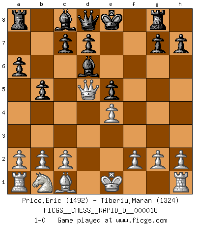 Last move : 1-0 2009 February 24 7:11:47 [Event "FICGS__CHESS__RAPID_D__000018"] [Site "FICGS"] [Date "2009.02.19"] [Round "1"] [White "Price,Eric"] [Black "Tiberiu,Maran"] [Result "1-0"] [WhiteElo "1492"] [BlackElo "1324"] 1.e4 e5 2.Nf3 Nc6 3.Bb5 f6 4.d4 a6 5.Bc4 b5 6.Bb3 Bd6 7.dxe5 Nxe5 8.Nxe5 fxe5 9.Bxg8 Rxg8 10.Qd5 1-0 Ruy Lopez : Nuernberg variation Player White won this chess game. Follow this game move after move (download)The game of chess is the touchstone of the intellect. (Goethe) Obwohl ich alt bin, darf mir niemand den Finger in den Mund stecken, sonst beisse ich. (Wilhelm Steinitz) Yo siempre he tenido un ligero sentimiento de lástima por una persona que no tiene conocimiento del Ajedrez. (Siegbert Tarrasch) La vie est comme un jeu d'échecs : nous esquissons un plan, mais celui-ci est tributaire de ce que daignent faire l'adversaire aux échecs et le destin dans la vie. (Arthur Schopenhauer) We need strong personalities and only one world champion to attract sponsors. (Anatoly Karpov)