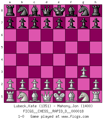 Last move : 1-0 2009 March 21 23:29:46 [Event "FICGS__CHESS__RAPID_D__000018"] [Site "FICGS"] [Date "2009.02.19"] [Round "1"] [White "Lubeck,Kate"] [Black "Mahony,Jon"] [Result "1-0"] [WhiteElo "1351"] [BlackElo "1400"] 1.g3 1-0 This chess game has been lost on time (started : 2009.02.19 13:30:27) Benko's Opening Player White won this chess game. Follow this game move after move (download)Everything is in a state of flux, and this includes the world of Chess. (Mikhail Botvinnik) Ich verstehe mehr vom Schach als irgendein anderer lebender Meister. (José Raúl Capablanca) Aún deseo matar a Fischer. (Boris Spassky) Le jeu d'échecs est comme rejeté hors du temps. (Antoine de Saint-Exupéry) Nothing is more important for teaching us to understand the concepts we have than constructing fictitious ones. (Ludwig Wittgenstein)