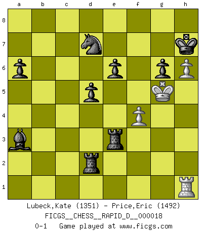 Last move : 0-1 2009 March 10 18:7:41 [Event "FICGS__CHESS__RAPID_D__000018"] [Site "FICGS"] [Date "2009.02.19"] [Round "1"] [White "Lubeck,Kate"] [Black "Price,Eric"] [Result "0-1"] [WhiteElo "1351"] [BlackElo "1492"] 1.g3 g6 2.Bh3 Bg7 3.Nf3 Nf6 4.O-O O-O 5.a4 d5 6.Ra3 Bxh3 7.Re1 c5 8.Ng5 Qc8 9.e3 h6 10.Nxh3 Qxh3 11.Qf3 Ng4 12.Qg2 Qxg2+ 13.Kxg2 Ne5 14.Nc3 e6 15.f4 Ned7 16.Nb5 Rc8 17.Nd6 Rc7 18.c3 Bf8 19.Nb5 Rc8 20.b4 a6 21.Nd6 Bxd6 22.bxc5 Nxc5 23.h4 Nd3 24.Rd1 Nxc1 25.Rxc1 Bxa3 26.Rb1 Rc7 27.g4 Nd7 28.g5 Rb8 29.gxh6 b5 30.axb5 Rxb5 31.Rh1 Rb2 32.h5 Rxd2+ 33.Kf3 Kh7 34.hxg6+ fxg6 35.Kg4 Rxc3 36.Kg5 Rxe3 0-1 Benko's Opening Kingside Castling by player White (move 4) Kingside Castling by player Black (move 4) Player Black won this chess game. Follow this game move after move (download)White lost because he failed to remember the right continuation and had to think up the moves himself. (Siegbert Tarrasch) Spiel ein langweiliges Spiel zu Ende und lustige Dinge können passieren. (Hans Ree) ¿Que sería del Ajedrez sin errores graciosos?. (Kurt Richter) Que feriez-vous si vous étiez en train de jouer aux échecs et que la fin du monde arrive ? Je continuerais à jouer. (Saint Borromée) If passion drives you, let reason holds the reins. (Benjamin Franklin)
