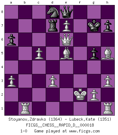 Last move : 1-0 2009 March 12 21:9:3 [Event "FICGS__CHESS__RAPID_D__000018"] [Site "FICGS"] [Date "2009.02.19"] [Round "1"] [White "Stoyanov,Zdravko"] [Black "Lubeck,Kate"] [Result "1-0"] [WhiteElo "1364"] [BlackElo "1351"] 1.e4 e5 2.Nf3 Bd6 3.Be2 Nf6 4.d3 O-O 5.a3 Bc5 6.Nxe5 d6 7.Nf3 Re8 8.h3 c6 9.b4 Bxf2+ 10.Kxf2 Qb6+ 11.Be3 c5 12.bxc5 dxc5 13.Nc3 Nc6 14.Na4 Qa5 15.Nxc5 b6 16.Bd2 Qxc5+ 17.Be3 Qd6 18.c4 a6 19.Bxb6 Nd7 20.Be3 Nde5 21.c5 Qg6 22.Qa4 Bd7 23.Nxe5 Nxe5 24.Qd4 f5 25.Bf4 Nc6 26.Qxd7 Ra7 27.Qd5+ Re6 28.exf5 Qe8 29.fxe6 Nd8 30.e7 Nf7 31.Bd6 Rd7 32.Rab1 g5 33.Qe6 Kg7 34.Bh5 Nd8 35.Be5+ 1-0 King's knight Opening Kingside Castling by player Black (move 4) Player White won this chess game. Follow this game move after move (download)Help your pieces so they can help you. (Paul Morphy) Wenn du auf das Glück wartest, wird das Leben ziemlich langweilig. (Mikhail Nekhemyevich Tal) El Peón aislado arroja penumbra sobre todo el tablero. (Aaron Nimzovich) Aux échecs, les retours au sommet sont rares : les dommages psychologiques consécutifs à une défaite sont trop sévères. (Daily Telegraph) Memory is a crazy woman that hoards colored rags and throws away food. (Austin O'Malley)