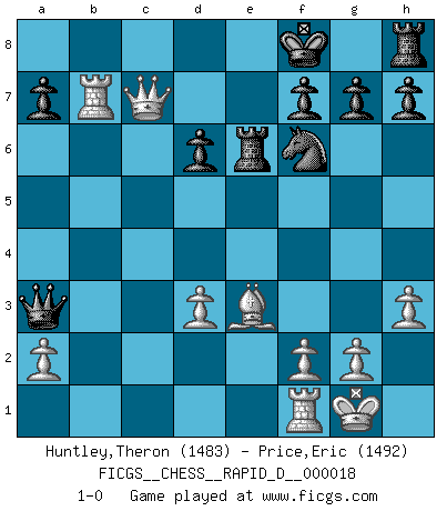 Last move : 1-0 2009 February 23 22:27:19 [Event "FICGS__CHESS__RAPID_D__000018"] [Site "FICGS"] [Date "2009.02.19"] [Round "1"] [White "Huntley,Theron"] [Black "Price,Eric"] [Result "1-0"] [WhiteElo "1483"] [BlackElo "1492"] 1.e4 e6 2.c4 d5 3.exd5 exd5 4.cxd5 Qxd5 5.Nc3 Qa5 6.Bc4 Nf6 7.Nf3 Bd6 8.Qe2+ Kf8 9.d3 Bg4 10.h3 Bxf3 11.Qxf3 Nc6 12.O-O Re8 13.Be3 Qb4 14.Nb5 Qxb2 15.Nxd6 cxd6 16.Rab1 Qa3 17.Rxb7 Ne5 18.Qc6 Nxc4 19.Qxc4 Re6 20.Qc7 1-0 French defense, Steiner variation Kingside Castling by player White (move 12) Player White won this chess game. Follow this game move after move (download)My God, Bobby Fischer plays so simply. (Alexei Suetin) Ich habe kein Problem mit Frauen, sondern nur mit dem Niveau ihres Schachspiels (Judith Polgar) El juego de Fischer siempre fue nítido, racional y brillante. Uno de los mejores por siempre. (Dave Regis) Donnez-moi un Cavalier en 6e et je gagnerais toutes mes parties. (Steinitz) A generalist learns less and less about more and more until he knows nothing about everything. (Author unknown)