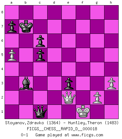 Last move : 0-1 2009 February 26 14:49:14 [Event "FICGS__CHESS__RAPID_D__000018"] [Site "FICGS"] [Date "2009.02.19"] [Round "1"] [White "Stoyanov,Zdravko"] [Black "Huntley,Theron"] [Result "0-1"] [WhiteElo "1364"] [BlackElo "1483"] 1.e4 c5 2.Nf3 d6 3.h3 Nc6 4.Bb5 Nf6 5.Bxc6+ bxc6 6.d3 g6 7.Bg5 Rb8 8.Bxf6 exf6 9.b3 f5 10.Nbd2 Bg7 11.Rb1 fxe4 12.Nxe4 f5 13.Ng3 Qa5+ 14.Nd2 Bc3 15.O-O Bxd2 16.Qe2+ Be3 17.Qxe3+ Kf7 18.Rfe1 Qd8 19.Ne2 Re8 20.Qh6 Kg8 21.Nf4 Rb7 22.Re3 Rxe3 23.fxe3 Re7 24.Re1 Qa5 25.Rf1 Qd2 26.Nxg6 hxg6 27.Qxg6+ Kf8 28.Qf6+ Ke8 29.Qg6+ Kd7 30.Qxf5+ Kc7 31.Qf4 Qxc2 32.Qa4 Kb7 33.Qf4 Qxd3 34.Re1 Qd2 35.Qg3 d5 36.a4 d4 37.Kf1 Rxe3 38.Rxe3 dxe3 39.Qf3 Be6 40.Qe2 Bxb3 41.a5 Qc1+ 0-1 Sicilian Kingside Castling by player White (move 15) Player Black won this chess game. Follow this game move after move (download)Only the player with the initiative has the right to attack. (Wilhelm Steinitz) Es ist im Leben wie im Schachspiel. Wir entwerfen einen Plan, dieser bleibt jedoch bedingt durch das, was im Schachspiel dem Gegner, im Leben dem Schicksal zu tun belieben wird. (Arthur Schopenhauer) Con el tiempo, empecé a progresar en partidas decisivas. Tal vez porque me di cuenta de una simple verdad: no solo estaba yo nervioso sino también mi oponente. (Mikhail Tal) Même un GMI sait rarement calculer sur plus de cinq coups une attaque à sacrifices. (Rudolf Spielmann) Fear is the path to the dark side. Fear leads to anger; anger leads to hate; hate leads to suffering. I sense much fear in you. (Master Yoda in Star Wars ep.1)