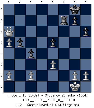 Last move : 1-0 2009 February 24 19:8:11 [Event "FICGS__CHESS__RAPID_D__000018"] [Site "FICGS"] [Date "2009.02.19"] [Round "1"] [White "Price,Eric"] [Black "Stoyanov,Zdravko"] [Result "1-0"] [WhiteElo "1492"] [BlackElo "1364"] 1.e4 e5 2.Nf3 d6 3.d4 Bg4 4.dxe5 Bxf3 5.Qxf3 dxe5 6.Bc4 Nf6 7.Bg5 h6 8.Bxf6 Qxf6 9.Qb3 Bc5 10.O-O b6 11.Nc3 O-O 12.Nd5 Qd6 13.Rad1 Nc6 14.Ne3 Qf6 15.Bd5 Na5 16.Qa4 c6 17.b4 Bxe3 18.fxe3 Qg6 19.Bxf7+ Rxf7 20.bxa5 b5 21.Qb3 Raf8 22.Rd7 a6 23.Rf5 c5 24.Qd5 c4 25.Rd6 Qxd6 26.Qxd6 Rxf5 27.exf5 Rxf5 28.Qe6+ Rf7 29.Qxa6 1-0 Philidor's defense Kingside Castling by player White (move 10) Kingside Castling by player Black (move 11) Player White won this chess game. Follow this game move after move (download)Winning isn't everything... but losing is nothing. (Mednis) Ich habe Kasparov in Rente geschickt. (Veselin Topalov) Todos los Maestros de Ajedrez fueron un día unos principiantes. (Chernev) Psychologiquement, tu dois avoir confiance en toi même, mais cette confiance doit être basée sur des faits. (Robert Fischer) Kids, you tried your best and you failed miserably. The lesson is, never try. (Simpsons)