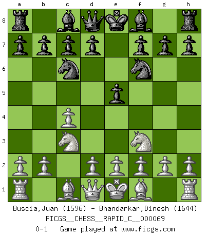 Last move : 0-1 2009 March 30 1:33:27 [Event "FICGS__CHESS__RAPID_C__000069"] [Site "FICGS"] [Date "2009.02.19"] [Round "1"] [White "Buscia,Juan"] [Black "Bhandarkar,Dinesh"] [Result "0-1"] [WhiteElo "1596"] [BlackElo "1644"] 1.c4 e5 2.Nc3 Nf6 3.Nf3 Nc6 0-1 This chess game has been lost on time (started : 2009.02.19 22:22:40) English Opening Player Black won this chess game. Follow this game move after move (download)I still hope to kill Fischer. (Boris Spassky) Irgendwie scheint mir sonntags früh um 9 Uhr der Killerinstinkt verloren gegangen zu sein. (Alexej Shirov) Un jugador que es sorprendido, esta derrotado a medias. (Proverbio) Botvinnik disait en comparant les échecs à la musique: Il existe une science dont le but est l'étude de l'acoustique et des sons. Mais il y a aussi un art qui se sert de l'océan des sons : c'est la musique. De toute évidence, il en est de même pour la pensée. La logique est l'étude des lois de la réflexion et les échecs reflètent, en tant qu'art, le côté logique de la réflexion, sous la forme d'images artistiques... Extrait de Fischer - Spassky, Reykjavik 1972 par Alexander & F. Wyndham (Ed. Solar), p 37. A proverb is a short sentence based on long experience. (Miguel de Cervantes)