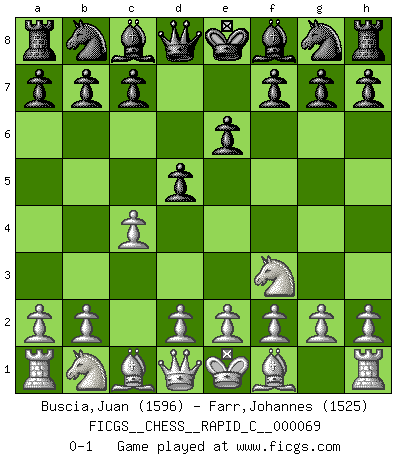 Last move : 0-1 2009 March 24 23:56:36 [Event "FICGS__CHESS__RAPID_C__000069"] [Site "FICGS"] [Date "2009.02.19"] [Round "1"] [White "Buscia,Juan"] [Black "Farr,Johannes"] [Result "0-1"] [WhiteElo "1596"] [BlackElo "1525"] 1.c4 e6 2.Nf3 d5 0-1 This chess game has been lost on time (started : 2009.02.19 22:22:40) English Opening : Agincourt variation Player Black won this chess game. Follow this game move after move (download)Bobby just drops the pieces and they fall on the right squares. (Miguel Najdorf) Ich bewundere Kasparows phantasievolle Angriffssiege aus den Achtzigern und Neunzigern, aber wenn man sie mit dem Computer überprüft, nimmt der Computer in jeder zweiten Partie die Opfer an, verteidigt sich und gewinnt. (Vladimir Kramnik) Ciertamente, de todas la drogas del mundo, el Ajedrez debe ser el mas placentero permamentemente. (Assiac) Les Echecs ne sont pas pour les âmes timides. Ils requièrent un homme entier, qui ne s'arrête pas aveuglément à ce qui a été déjà établi, mais qui tente individuellement de sonder les profondeurs du jeu. (W. Steinitz) I don't believe in psychology. I believe in good moves. (Bobby Fischer)
