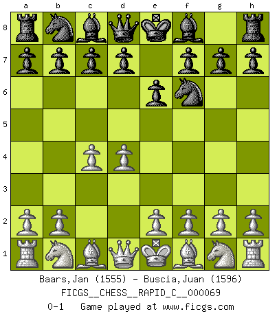 Last move : 0-1 2009 March 20 0:11:55 [Event "FICGS__CHESS__RAPID_C__000069"] [Site "FICGS"] [Date "2009.02.19"] [Round "1"] [White "Baars,Jan"] [Black "Buscia,Juan"] [Result "0-1"] [WhiteElo "1555"] [BlackElo "1596"] 1.d4 Nf6 2.c4 e6 0-1 Queen's pawn game Player Black won this chess game. Follow this game move after move (download)The way he plays Chess demonstrates a man's whole nature. (Stanley Ellin) Im Schach gewinnt jeder. Hat man Freunde am Spiel - und das ist die Hauptsache - ist auch der Verlust einer Partie kein Unglück. (David Bronstein) El jugador de combinación piensa hacia adelante; comienza de la posición dada y trabaja las movidas contundentes en su mente. (Emanuel Lasker) Comme les marins qui ont mille raisons différentes d'aller en mer, les joueurs d'échecs en ont tout autant avant de s'installer devant une table et jouer... (Vincent Bertignac, philosophe) The problem with manipulation is that people can turn on you. (Horatio Caine, C.S.I. Miami)