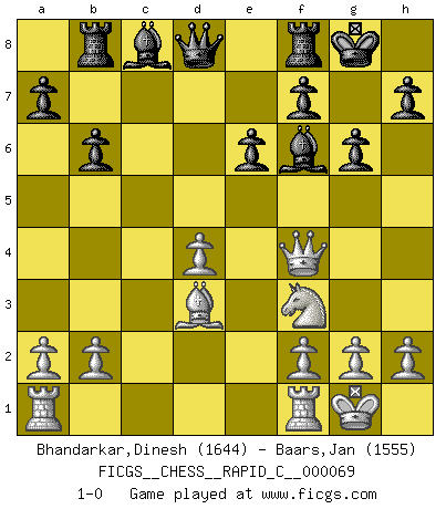 Last move : 1-0 2009 March 4 0:11:46 [Event "FICGS__CHESS__RAPID_C__000069"] [Site "FICGS"] [Date "2009.02.19"] [Round "1"] [White "Bhandarkar,Dinesh"] [Black "Baars,Jan"] [Result "1-0"] [WhiteElo "1644"] [BlackElo "1555"] 1.e4 c6 2.d4 d5 3.Nc3 dxe4 4.Nxe4 Nd7 5.Nf3 Ngf6 6.Nxf6+ Nxf6 7.Bc4 e6 8.O-O Be7 9.Qe2 O-O 10.c3 c5 11.Bg5 cxd4 12.cxd4 b6 13.Bxf6 Bxf6 14.Qe4 Rb8 15.Bd3 g6 16.Qf4 1-0 Caro-Kann : Steinitz variation Kingside Castling by player White (move 8) Kingside Castling by player Black (move 9) Player White won this chess game. Follow this game move after move (download)The passed Pawn is a criminal, who should be kept under lock and key. Mild measures, such as police surveillance, are not sufficient. (Aaron Nimzovich) Die größte Kunst beim Schach besteht darin dem Gegner nicht zu zeigen was er tun kann. (Garry Kasparov) Preferería tener un Peón que un dedo. (Reuben Fine) Le jeu d'échecs est comme rejeté hors du temps. (Antoine de Saint-Exupéry) If everyone is thinking alike, then somebody isn't thinking. (US General George S. Patton)
