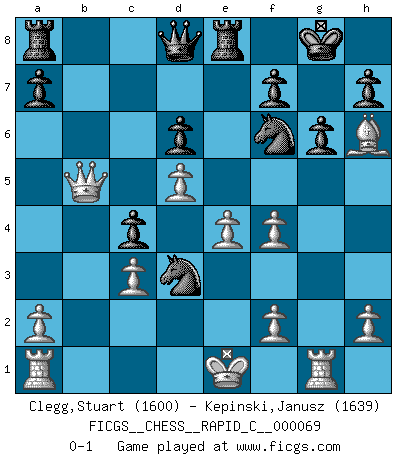 Last move : 0-1 2009 March 22 22:50:3 [Event "FICGS__CHESS__RAPID_C__000069"] [Site "FICGS"] [Date "2009.02.19"] [Round "1"] [White "Clegg,Stuart"] [Black "Kepinski,Janusz"] [Result "0-1"] [WhiteElo "1600"] [BlackElo "1639"] 1.c4 g6 2.Nc3 Bg7 3.d4 d6 4.e4 c5 5.d5 Bxc3+ 6.bxc3 Nf6 7.Bd3 O-O 8.Nf3 Bg4 9.Bh6 Re8 10.Qb3 Bxf3 11.gxf3 Nbd7 12.f4 e6 13.Qxb7 exd5 14.cxd5 c4 15.Rg1 Nc5 16.Qb5 Nxd3+ 0-1 English Opening Kingside Castling by player Black (move 7) Player Black won this chess game. Follow this game move after move (download)Every Chess master was once a beginner. (Chernev) Kostenjuk hat keinen Sexappeal. (Loek van Wely) El Ajedrez es el gimnasio de la mente. (Blaise Pascal) La conception d'un plan est le processus par lequel un joueur exploite les avantages de sa position tout en s'efforçant d'en réduire au minimum les inconvénients. Afin de garantir le succès, un plan doit toujours se fonder sur un diagnostic objectif des particularités d'une position. La conception d'un plan est d'autant plus difficile que la position est équilibrée, et grandement facilitée lorsqu'il n'existe qu'un seul plan susceptible de répondre aux exigences de la position. (Harry Golombek) Creativity is inventing, experimenting, growing, taking risks, breaking rules, making mistakes, and having fun. (Mary Lou Cook)