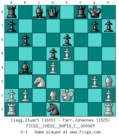 Last move : 0-1 2009 February 23 18:15:56 [Event "FICGS__CHESS__RAPID_C__000069"] [Site "FICGS"] [Date "2009.02.19"] [Round "1"] [White "Clegg,Stuart"] [Black "Farr,Johannes"] [Result "0-1"] [WhiteElo "1600"] [BlackElo "1525"] 1.e4 e6 2.d4 d5 3.Nd2 Nf6 4.e5 Nfd7 5.f4 c5 6.c3 Nc6 7.Ndf3 cxd4 8.cxd4 Be7 9.g3 O-O 10.Bh3 b6 11.Ne2 f5 12.exf6 Nxf6 13.Ne5 Nxe5 14.fxe5 Ne4 15.Nc3 Bb4 16.Bd2 Nf2 17.Ke2 Nxd1 0-1 French : Tarrasch, Closed variation Kingside Castling by player Black (move 9) Player Black won this chess game. Follow this game move after move (download)There just isn't enough televised Chess. (David Letterman) Kein Großmeister ist normal. Sie unterscheiden sich nur im Ausmaß Ihrer Verrücktheit. (Viktor Kortschnoi) Con el tiempo, empecé a progresar en partidas decisivas. Tal vez porque me di cuenta de una simple verdad: no solo estaba yo nervioso sino también mi oponente. (Mikhail Tal) Des points faibles ou des trous dans la position de l'adversaire doivent être occupés par des pièces et non pas par des pions. (Siegbert Tarrasch) Vladimir Ras-Putin is still alive... He is also a good actor, I saw him in the Lord of the Rings. (Rodolfo d'Ettorre)