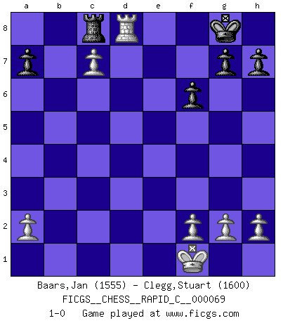 Last move : 1-0 2009 February 24 14:29:40 [Event "FICGS__CHESS__RAPID_C__000069"] [Site "FICGS"] [Date "2009.02.19"] [Round "1"] [White "Baars,Jan"] [Black "Clegg,Stuart"] [Result "1-0"] [WhiteElo "1555"] [BlackElo "1600"] 1.d4 d5 2.c4 e6 3.Nc3 Nf6 4.Bg5 Be7 5.e3 O-O 6.Nf3 b6 7.Bxf6 Bxf6 8.cxd5 exd5 9.Bd3 Ba6 10.Bxa6 Nxa6 11.O-O c5 12.dxc5 bxc5 13.Nxd5 Bxb2 14.Rb1 Rb8 15.e4 Nc7 16.Ne3 Qe7 17.Qc2 Bd4 18.Rxb8 Rxb8 19.Nxd4 cxd4 20.Nd5 Nxd5 21.exd5 Rb5 22.Qc6 Rb2 23.d6 Qd8 24.Qc7 Rb8 25.Rc1 d3 26.Rd1 Qxc7 27.dxc7 Re8 28.Kf1 f6 29.Rxd3 Rc8 30.Rd8+ 1-0 QGD : 6.Nf3 Kingside Castling by player Black (move 5) Kingside Castling by player White (move 11) Player White won this chess game. Follow this game move after move (download)Best by test: 1. e4 (Bobby Fischer) Du musst nicht gut spielen, es reicht, wenn du besser spielst als dein Gegner. (Anonymous) Entre mas años cumplo, mas valoro los Peones. (Keres) Un journaliste : 'Vous préférez avoir une dame de plus sur l'échiquier ou au lit ?' Boris Spassky : 'Ca dépend de la position.' If things go wrong, don't go with them. (Roger Babson)