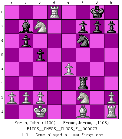 Last move : 1-0 2009 April 20 10:33:7 [Event "FICGS__CHESS__CLASS_F__000073"] [Site "FICGS"] [Date "2009.02.20"] [Round "1"] [White "Marin,John"] [Black "Frame,Jeremy"] [Result "1-0"] [WhiteElo "1100"] [BlackElo "1105"] 1.e4 e5 2.Nf3 Nf6 3.d4 d6 4.Nc3 Be7 5.dxe5 dxe5 6.Qxd8+ Bxd8 7.Nxe5 Nbd7 8.Nd3 O-O 9.f3 b6 10.Bf4 Bb7 11.O-O-O c5 12.g4 Rc8 13.Nf2 Bc7 14.Bxc7 Rxc7 15.Nb5 Rfc8 16.g5 Rc6 17.Nxa7 R8c7 18.gxf6 Rxf6 19.Nb5 Rxf3 20.Nxc7 Nf6 21.Rd8+ 1-0 Petrov : Modern (Steinitz) attack Kingside Castling by player Black (move 8) Queenside Castling by player White (move 11) Player White won this chess game. Follow this game move after move (download)My opponents make good moves too. Sometimes I don't take these things into consideration. (Bobby Fischer) Wenn ich gewinne bin ich ein Genie. Wenn nicht, dann bin ich keines. (Robert James Fischer) Por tratar de evitar la pérdida de una pieza, muchas personas han perdido una partida de Ajedrez. (Savielly Tartakover) La vérité est comme le meilleur coup aux échecs : elle existe, mais il faut la chercher. (Arturo Perez-Reverte) Life is pain my dear and anyone who says otherwise is selling something. (Princess Bride)