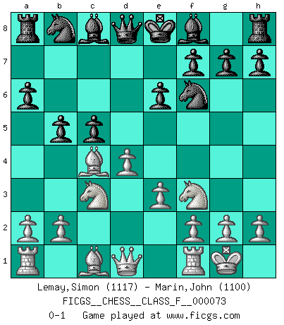 Last move : 0-1 2009 April 30 4:33:28 [Event "FICGS__CHESS__CLASS_F__000073"] [Site "FICGS"] [Date "2009.02.20"] [Round "1"] [White "Lemay,Simon"] [Black "Marin,John"] [Result "0-1"] [WhiteElo "1117"] [BlackElo "1100"] 1.d4 d5 2.c4 dxc4 3.e3 e6 4.Bxc4 c5 5.Nf3 a6 6.Nc3 Nf6 7.O-O b5 0-1 This chess game has been lost on time (started : 2009.02.20 14:58:11) Queen's gambit accepted Kingside Castling by player White (move 7) Player Black won this chess game. Follow this game move after move (download)I have never in my life played the French Defence, which is the dullest of all openings. (Wilhelm Steinitz) Kann Schach nicht schließlich das Nationalspiel der Deutschen werden? Und welche weiteren Ausblicke bieten sich dann dar! Welche Hebung des allgemeinen Kultur-Niveaus, ja der Moral, wenn das Schachbrett den Kartentisch verdrängen würde! Wahrlich, ein Ziel, des Schweißes der Edlen wert! (Siegbert Tarrasch) El Ajedrez era la lengua materna de Capablanca. (Reti) A chaque perte on perd un peu de soi. (Joël Lautier) I have opinions of my own - strong opinions - but I don't always agree with them. (George Bush)