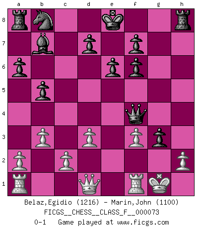 Last move : 0-1 2009 April 23 20:58:8 [Event "FICGS__CHESS__CLASS_F__000073"] [Site "FICGS"] [Date "2009.02.20"] [Round "1"] [White "Belaz,Egidio"] [Black "Marin,John"] [Result "0-1"] [WhiteElo "1216"] [BlackElo "1100"] 1.e4 c5 2.Bc4 a6 3.Nf3 Nf6 4.Ne5 e6 5.Nc3 b5 6.Be2 Qc7 7.Nd3 c4 8.e5 cxd3 9.exf6 dxe2 10.Nxe2 gxf6 11.O-O Bb7 12.d3 Bd6 13.g3 h5 14.b3 h4 15.Nf4 Bxf4 16.Bxf4 Qxf4 17.f3 hxg3 0-1 Sicilian defense Kingside Castling by player White (move 11) Player Black won this chess game. Follow this game move after move (download)First-class players lose to second-class players because second-class players sometimes play a first-class game. (Siegbert Tarrasch) Nur ein wirklich starker Spieler weiß wie schwach er spielt. (Savielly Grigorievitsch Tartakower) Hay dos clases de hombres: aquellos que se conforman en dejarse llevar por las circunstancias y que juegan barajas y aquellos decididos a controlar las circunstancias y que juegan al Ajedrez. (Mortimer Collins) Soyez une menace à chaque fois que vous vous asseyez pour jouer. (Ken Smith) Live, lose, and learn, by observing your opponent how to win. (Amber Steenbock)