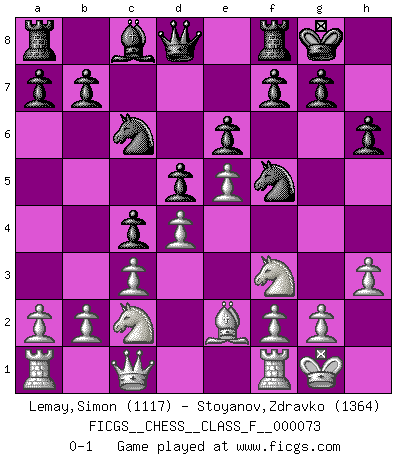 Last move : 0-1 2009 May 15 6:4:23 [Event "FICGS__CHESS__CLASS_F__000073"] [Site "FICGS"] [Date "2009.02.20"] [Round "1"] [White "Lemay,Simon"] [Black "Stoyanov,Zdravko"] [Result "0-1"] [WhiteElo "1117"] [BlackElo "1364"] 1.e4 c6 2.d4 d5 3.e5 e6 4.Nf3 Ne7 5.Bg5 h6 6.Bh4 Qb6 7.Qc1 Nf5 8.c3 Be7 9.Bxe7 Nxe7 10.Bd3 O-O 11.O-O c5 12.Na3 c4 13.Be2 Nf5 14.h3 Qd8 15.Nc2 Nc6 0-1 This chess game has been lost on time (started : 2009.02.20 14:58:11) Caro-Kann : Advance variation Kingside Castling by player Black (move 10) Kingside Castling by player White (move 11) Player Black won this chess game. Follow this game move after move (download)An attack on the wing should be met by play in the center. (Nimzovitch) Je mehr wir mit Computern analysieren, desto mehr glauben wir an Verteidigung. (Vladimir Kramnik) Los problemas de Ajedrez exigen del compositor las mismas virtudes que caracterizan todo el arte de valor: originalidad, invención, concisión, armonía, complejidad e insinceridad explendida. (Vladimir Nabokov) Un journaliste : 'Vous préférez avoir une dame de plus sur l'échiquier ou au lit ?' Boris Spassky : 'Ca dépend de la position.' My poor ole parrot... Is not in the circulation of displays ....poo hoo hoo :) (Wayne Lowrance's enigma)