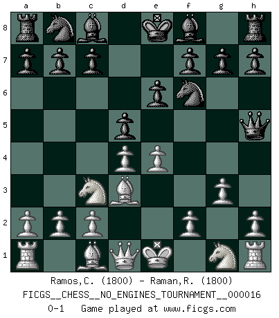 Last move : 0-1 2009 April 13 14:38:25 [Event "FICGS__CHESS__NO_ENGINES_TOURNAMENT__000016"] [Site "FICGS"] [Date "2009.02.20"] [Round "1"] [White "Ramos,Cristobal"] [Black "Raman,Ranganathan"] [Result "0-1"] [WhiteElo "1800"] [BlackElo "1800"] 1.e4 e6 2.d4 Qh4 3.Nc3 Nf6 4.Bd3 d5 5.g3 Qh5 0-1 This chess game has been lost on time (started : 2009.02.20 22:53:1) French defense Player Black won this chess game. Follow this game move after move (download)One of these modest little moves may be more embarrassing to your opponent than the biggest threat. (Siegbert Tarrasch) Ein guter Spieler hat immer Glück. (José Raúl Capablanca) Cuando tu no sabes absolutamente que mas hacer, es tiempo de entrar en pánico. (John van der Wiel) En blitz, le Cavalier l'emporte sur le Fou. (Vlastimil Hort) I would love to change the world, but they won't give me the source code. (Unknown)
