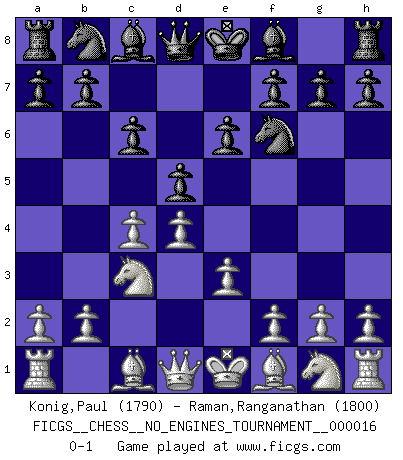 Last move : 0-1 2009 March 12 21:18:17 [Event "FICGS__CHESS__NO_ENGINES_TOURNAMENT__000016"] [Site "FICGS"] [Date "2009.02.20"] [Round "1"] [White "Konig,Paul"] [Black "Raman,Ranganathan"] [Result "0-1"] [WhiteElo "1790"] [BlackElo "1800"] 1.d4 Nf6 2.c4 e6 3.Nc3 d5 4.e3 c6 0-1 Queen's pawn game Player Black won this chess game. Follow this game move after move (download)Openings teach you openings. Endgames teach you chess ! (Stephan Gerzadowicz) Ich hatte Zahnschmerzen im ersten Spiel. In der zweiten Partie tat mir der Kopf weh. In der dritten war es eine Rheuma-Attacke und während der vierten fühlte ich mich nicht gut. Und in der fünften? Nun, man muss doch nicht jedes Spiel gewinnen, oder? (Savielly Grigorievitsch Tartakower) Aún el Rey más flojo huye despavorido ante la amenaza de un Jaque doble. (Aaron Nimzowitsch) Mon pion favori sur ma case favorite ! Bronstein en parlant d'un coup de pion en h5 quand il avait les Noirs. That's absurd. I love it. (Gregory House, House M.D.)