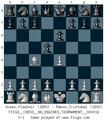 Last move : 0-1 2009 April 13 2:38:23 [Event "FICGS__CHESS__NO_ENGINES_TOURNAMENT__000016"] [Site "FICGS"] [Date "2009.02.20"] [Round "1"] [White "Gusev,Vladimir"] [Black "Ramos,Cristobal"] [Result "0-1"] [WhiteElo "1800"] [BlackElo "1800"] 1.e4 e6 2.Bc4 d5 0-1 This chess game has been lost on time (started : 2009.02.20 22:53:1) French defense Player Black won this chess game. Follow this game move after move (download)Chess mastery essentially consists of analyzing Chess positions accurately. (Mikhail Botvinnik) Obwohl ich alt bin, darf mir niemand den Finger in den Mund stecken, sonst beisse ich. (Wilhelm Steinitz) Todavía soy una víctima del Ajedrez. Tiene toda la belleza del arte y mucho mas. No puede ser comercializado. El Ajedrez es mas puro que el arte en su posición social. (Marcel Duchamp) Les échecs sont utiles à l'exercice de la faculté de penser et à celle de l'imagination. Car nous devons posséder une méthode élaborée pour atteindre des buts partout où nous devons conduire notre raison. (Leibnitz) Luck is the residue of design. (John Milton)