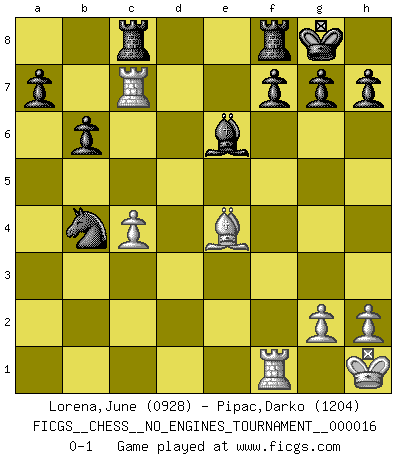 Last move : 0-1 2009 May 13 17:51:8 [Event "FICGS__CHESS__NO_ENGINES_TOURNAMENT__000016"] [Site "FICGS"] [Date "2009.02.20"] [Round "1"] [White "Lorena,June"] [Black "Pipac,Darko"] [Result "0-1"] [WhiteElo "0928"] [BlackElo "1204"] 1.d4 d5 2.Nc3 Nc6 3.e4 dxe4 4.f3 Qxd4 5.fxe4 Nf6 6.Qxd4 Nxd4 7.Bd3 e5 8.Nge2 Bb4 9.O-O Bxc3 10.bxc3 Nxe2+ 11.Kh1 Nxc3 12.Bb2 Nfxe4 13.Bxc3 Nxc3 14.Rae1 O-O 15.Rxe5 Nxa2 16.Re7 Be6 17.Rxc7 b6 18.c4 Nb4 19.Be4 Rac8 0-1 This chess game has been lost on time (started : 2009.02.20 22:53:1) Queen's pawn : Chigorin variation Kingside Castling by player White (move 9) Kingside Castling by player Black (move 14) Player Black won this chess game. Follow this game move after move (download)You need not play well - just help your opponent to play badly. (Genrikh Chepukaitis) Ich hatte meine größten Erfolge, als ich 47 Jahre alt war. Kasparow war noch nicht mal 42 und hat das Schach schon im Stich gelassen. (Viktor Kortschnoi) Bobby es la celebridad menos entendida y malinterpretada que camina el la faz de esta tierra. (Yasser Seirawan) Ce qui caractérise les parties de combat, c'est que si le défenseur a constamment de difficiles problèmes à résoudre, l'attaquant doit chercher sans relâche de nouvelles possibilités d'attaque. (Koblentz) It's unlucky to be superstitious. (Dave Enteles)