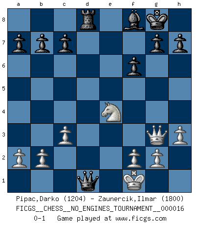 Last move : 0-1 2009 February 24 12:2:3 [Event "FICGS__CHESS__NO_ENGINES_TOURNAMENT__000016"] [Site "FICGS"] [Date "2009.02.20"] [Round "1"] [White "Pipac,Darko"] [Black "Zaunercik,Ilmar"] [Result "0-1"] [WhiteElo "1204"] [BlackElo "1800"] 1.e4 e5 2.d4 exd4 3.c3 Nc6 4.Nf3 d6 5.Bb5 Bd7 6.Nxd4 Nxd4 7.Bxd7+ Qxd7 8.Qxd4 Nf6 9.h3 Be7 10.O-O O-O 11.Bf4 Rfe8 12.Nd2 Bf8 13.Rad1 Qc6 14.e5 dxe5 15.Bxe5 Rad8 16.Qf4 Nh5 17.Qg5 f6 18.Qxh5 Rxe5 19.Qf3 Red5 20.Qe3 Qd7 21.Ne4 Rxd1 22.Qg3 Rxf1+ 23.Kxf1 Qd1+ 0-1 Danish gambit Kingside Castling by player White (move 10) Kingside Castling by player Black (move 10) Player Black won this chess game. Follow this game move after move (download)I still hope to kill Fischer. (Boris Spassky) Die Arbeit ist etwas Unnatürliches. Die Faulheit allein ist göttlich. (Anatole France) Los Peones son nacidos libres, y aún así, se encuentran por doquier encadenados. (Rick Kennedy) Botvinnik disait en comparant les échecs à la musique: Il existe une science dont le but est l'étude de l'acoustique et des sons. Mais il y a aussi un art qui se sert de l'océan des sons : c'est la musique. De toute évidence, il en est de même pour la pensée. La logique est l'étude des lois de la réflexion et les échecs reflètent, en tant qu'art, le côté logique de la réflexion, sous la forme d'images artistiques... Extrait de Fischer - Spassky, Reykjavik 1972 par Alexander & F. Wyndham (Ed. Solar), p 37. It's not a bug - it's an undocumented feature. (Anonymous)