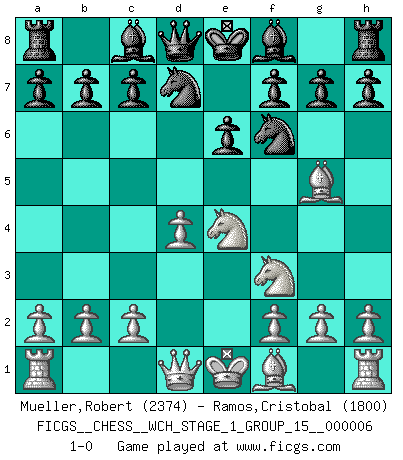 Last move : 1-0 2009 April 1 13:40:4 [Event "FICGS__CHESS__WCH_STAGE_1_GROUP_15__000006"] [Site "FICGS"] [Date "2009.02.22"] [Round "1"] [White "Mueller,Robert"] [Black "Ramos,Cristobal"] [Result "1-0"] [WhiteElo "2374"] [BlackElo "1800"] 1.e4 e6 2.d4 d5 3.Nc3 Nf6 4.Bg5 dxe4 5.Nxe4 Nbd7 6.Nf3 1-0 This chess game has been lost on time (started : 2009.02.22 16:42:29) French : Burn variation Player White won this chess game. Follow this game move after move (download)You can only get good at Chess if you love the game. (Bobby Fischer) Als ich elf wurde, wurde ich einfach gut. (Robert James Fischer) Ciertamente el estado mental actual de Bobby Fischer es una tragedia. Uno de los mas grandes jugadores de Ajedrez del mundo -el orgullo y pena del Ajedrez Americano. (Frank Brady) Les échecs sont un jeu terrible. Si vous n'avez pas le centre, votre adversaire a une position plus libre. Par contre, si vous avez le centre, alors vous avez vraiment quelque chose pour laquelle vous inquiéter ! (Siegbert Tarrasch) Animated gif is worth one mega-word. (Unknown)