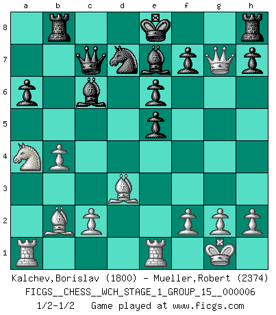 Last move : 1/2-1/2 2009 March 16 17:11:0 [Event "FICGS__CHESS__WCH_STAGE_1_GROUP_15__000006"] [Site "FICGS"] [Date "2009.02.22"] [Round "1"] [White "Kalchev,Borislav"] [Black "Mueller,Robert"] [Result "1/2-1/2"] [WhiteElo "1800"] [BlackElo "2374"] 1.e4 c5 2.Nf3 d6 3.d4 cxd4 4.Nxd4 Nf6 5.Nc3 a6 6.Bc4 e6 7.O-O b5 8.Bd3 Bb7 9.Re1 Be7 10.b4 Qc7 11.Bb2 Nc6 12.Nxc6 Bxc6 13.a4 bxa4 14.Nxa4 Rb8 15.e5 Nd7 16.Qg4 dxe5 17.Qxg7 Bf6 18.Qg4 Be7 19.Qg7 1/2-1/2 Sicilian : Najdorf, Lipnitzky attack Kingside Castling by player White (move 7) This chess game ended in a draw. Follow this game move after move (download)There just isn't enough televised Chess. (David Letterman) Über Karpov: Er war und ist ein Vertreter der russischen Reaktionäre. Das steckt tief in seiner Seele, wehalb ich nicht nett mit ihm umgehen kann. (Viktor Kortschnoi) Todo lo que importa ante el tablero de Ajedrez son buenas jugadas. (Bobby Fischer) Il n'y a pas eu de défaite parce que je ne crois pas que cet ordinateur ait jamais existé. IBM a triché en refusant d'imprimer les modes de recherche de la machine. C'est évident, pendant le match, des coups décisifs ont été joués par des êtres humains. Aujourd'hui, les meilleurs spécialistes en informatique ne peuvent toujours pas expliquer comment Deep-Blue a pu jouer contre la logique des ordinateurs. IBM a gagné une guerre de communication, mais ils sont incapables de prouver que l'ordinateur a gagné tout seul. (Garry Kasparov) The Movers & Shakers of this world are those who play chess in the mornings and go to the disco in the evenings. (Dinesh De Silva)