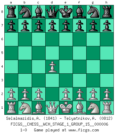 Last move : 1-0 2009 March 24 23:56:36 [Event "FICGS__CHESS__WCH_STAGE_1_GROUP_15__000006"] [Site "FICGS"] [Date "2009.02.22"] [Round "1"] [White "Selalmazidis,Arsenis"] [Black "Telyatnikov,Anatoly"] [Result "1-0"] [WhiteElo "1841"] [BlackElo "0812"] 1.d4 1-0 This chess game has been lost on time (started : 2009.02.22 16:42:29) Queen's pawn Player White won this chess game. Follow this game move after move (download)Bobby Fischer is the greatest Chess genius of all time ! (Alexander Kotov) Ich hatte Zahnschmerzen im ersten Spiel. In der zweiten Partie tat mir der Kopf weh. In der dritten war es eine Rheuma-Attacke und während der vierten fühlte ich mich nicht gut. Und in der fünften? Nun, man muss doch nicht jedes Spiel gewinnen, oder? (Savielly Grigorievitsch Tartakower) El hombre es un frívolo, una creatura engañosa y como un jugador de Ajedrez, se preocupa mas por el proceso de obtener su meta que de la meta por sí misma. (Dostoyevsky) Les Echecs, c'est l'art de la guerre sans les charniers, c'est la résurrection des morts tombés au champ d'honneur, l'espoir perpétuel, la suprématie de l'intelligence sur la force, la culture de l'esprit. (F. Szpiner) Man with more than one clock never knows what time it is. (Chinese thought)
