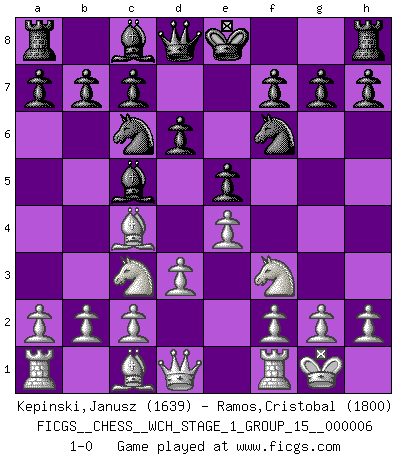 Last move : 1-0 2009 April 3 13:55:55 [Event "FICGS__CHESS__WCH_STAGE_1_GROUP_15__000006"] [Site "FICGS"] [Date "2009.02.22"] [Round "1"] [White "Kepinski,Janusz"] [Black "Ramos,Cristobal"] [Result "1-0"] [WhiteElo "1639"] [BlackElo "1800"] 1.Nc3 Nc6 2.e4 e5 3.Nf3 Nf6 4.Bc4 Bc5 5.d3 d6 6.O-O 1-0 This chess game has been lost on time (started : 2009.02.22 16:42:29) Dunst (Sleipner, Heinrichsen) Opening Kingside Castling by player White (move 6) Player White won this chess game. Follow this game move after move (download)He who fears an isolated Queen's Pawn should give up Chess. (Siegbert Tarrasch) Ich organisiere ein großes Turnier, was mich etwa 120000 Dollar kostet. Ich denke, das ist das erste Mal in der Schachgeschichte, daß ein Schachgroßmeister auch als Mäzen auftritt. (Miguel Najdorf) ¡Examina movidas que hagan daño! Un buen ojo for movidas desvastantes es mucho mas importante que el conocimiento de principios estratégicos. (Purdy) Même si vous avez un bon coup à faire, regardez toujours s'il n'y en a pas un qui lui soit préférable. (Pedro Damiano) . 'gn is not allowed in chess unless n is an integer between 1 and 8 inclusive, where 1 and 8 are to interpreted as the standard numerals standing for integers in the ordered real-closed field R, with the *canonical* ordering. (As opposed to, say, an integer in the domain Z[2+i*sqrt(5)] or an integer in some exotic Grothendieck topos). (Normajean Yates)