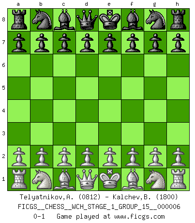 Last move : 0-1 2009 March 24 23:56:36 [Event "FICGS__CHESS__WCH_STAGE_1_GROUP_15__000006"] [Site "FICGS"] [Date "2009.02.22"] [Round "1"] [White "Telyatnikov,Anatoly"] [Black "Kalchev,Borislav"] [Result "0-1"] [WhiteElo "0812"] [BlackElo "1800"] 0-1 This chess game has been lost on time (started : 2009.02.22 16:42:29) Player Black won this chess game. Follow this game move after move (download)It began to feel as though you were playing against Chess itself. - On playing against Robert Fischer. (Walter Shipman) Ein typischer, sehr verbreiteter Gedankenschädling ist der, daß der betreffende Amateur von der Annanhme ausgeht, daß jeder einzelne Zug etwas zu leisten habe. (Aaron Nimzowitsch) Solo el jugador con la iniciativa tiene el derecho a atacar. (Wilhelm Steinitz) La solitude du joueur d'Echecs à l'approche du mat est semblable à celle du condamné. (Francis Szpiner) Opportunities multiply as they are seized. (Sun Tzu)