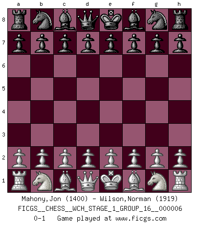Last move : 0-1 2009 March 24 23:56:36 [Event "FICGS__CHESS__WCH_STAGE_1_GROUP_16__000006"] [Site "FICGS"] [Date "2009.02.22"] [Round "1"] [White "Mahony,Jon"] [Black "Wilson,Norman"] [Result "0-1"] [WhiteElo "1400"] [BlackElo "1919"] 0-1 This chess game has been lost on time (started : 2009.02.22 16:46:34) Player Black won this chess game. Follow this game move after move (download)I give 98 percent of my mental energy to Chess. Others give only 2 percent. (Bobby Fischer) Schach ist wie eine schöne Frau, zu der wir ständig zurückkehren, gleichviel, wie oft sie uns zurückweist. (Anonymous) Tu no necesitas jugar muy bien, únicamente ayudar a tu oponenet a que juegue muy mal. (Genrikh Chepukaitis) Les erreurs sont comme les malheurs, elles n'arrivent jamais seules. (Siegbert Tarrasch) To err is human, to shift the blame on someone else is tactical. (Mladen Jankovic)