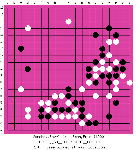 Last move : 1-0 2006 September 26 7:33:39 [Event "FICGS__GO__TOURNAMENT__000010"] [Site "FICGS"] [Date "2006.09.01"] [Round "1"] [Black "Vorobev,Pavel"] [White "Swan,Eric"] [Result "1-0"] [Rating 2 "1000"] 1.q16 d4 2.q3 d16 3.r9 n3 4.d10 c7 5.j4 k3 6.k4 l4 7.l5 j3 8.h4 h3 9.g3 g4 10.f4 g5 11.f3 f5 12.h5 d3 13.c13 k17 14.m4 l3 15.m5 h6 16.r5 k5 17.k6 j6 18.k7 r14 19.r15 q14 20.m3 m2 21.n2 r11 22.o2 p10 23.q11 q10 24.p13 q12 25.p12 p11 26.o15 r7 27.q8 q6 28.o8 r8 29.q9 s9 30.s10 t8 31.r10 o6 32.s11 m7 33.n10 o9 34.n9 n8 35.p9 o10 36.o11 1-0 Here are the names of the openings (joseki) played in the four corners : Corner d16 : d16 c13 Hoshi (Hwajeom, Seongjeom, Xingwei`) 4-4 Point. The star or hoshi (4-4) point, emphasizing influence at the potential expense of territory. Nikken Kakari (Dukan Keolch'im, E`r Gua`jiao~, 2-Space Low Approach). White typically answers by 7-3 or 3-5 (which is not joseki). Corner q16 : q16 r14 Hoshi (Hwajeom, Seongjeom, Xingwei`) 4-4 Point. The star or hoshi (4-4) point, emphasizing influence at the potential expense of territory. Ikken Kakari (Hankan Keolch'im, Yi Gua`jiao~, 1-Space Low Approach). White 2 is the standard approach move to the 4-4. Player Black won this Go (weiqi, baduk) game. Follow this game move after move (download)Five groups might live but the six will die. (Anonymous) They say poker is a zero-sum game. It must be, because every time I play my sum ends up zero. (Max Shapiro)