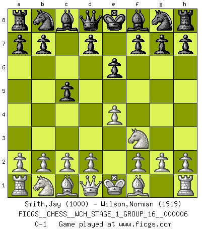 Last move : 0-1 2009 March 28 0:9:4 [Event "FICGS__CHESS__WCH_STAGE_1_GROUP_16__000006"] [Site "FICGS"] [Date "2009.02.22"] [Round "1"] [White "Smith,Jay"] [Black "Wilson,Norman"] [Result "0-1"] [WhiteElo "1000"] [BlackElo "1919"] 1.e4 c5 2.Nf3 e6 0-1 This chess game has been lost on time (started : 2009.02.22 16:46:34) Sicilian defense Player Black won this chess game. Follow this game move after move (download)It was clear to me that the vulnerable point of the American Grandmaster (Bobby Fischer) was in double-edged, hanging, irrational positions, where he often failed to find a win even in a won position. (Efim Geller) Je mehr ich von der FIDE weiss, um so weniger verstehe ich. (Alexander Kalifman) El Ajedrez es un mar en el cual un mosquito puede beber y un elefante puede bañarse. (Refrán Hindú) Il n'y a pas eu de défaite parce que je ne crois pas que cet ordinateur ait jamais existé. IBM a triché en refusant d'imprimer les modes de recherche de la machine. C'est évident, pendant le match, des coups décisifs ont été joués par des êtres humains. Aujourd'hui, les meilleurs spécialistes en informatique ne peuvent toujours pas expliquer comment Deep-Blue a pu jouer contre la logique des ordinateurs. IBM a gagné une guerre de communication, mais ils sont incapables de prouver que l'ordinateur a gagné tout seul. (Garry Kasparov) Wisdom doesn't necessarily come with age. Sometimes age just shows up all by itself. (Tom Watson)