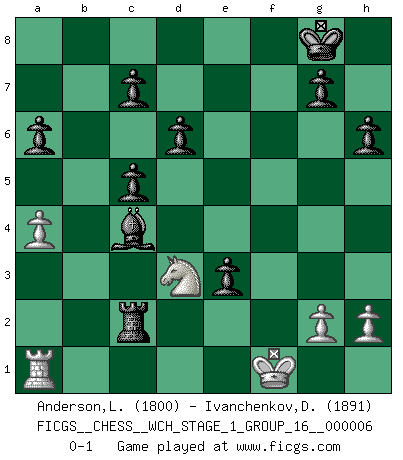 Last move : 0-1 2009 May 18 23:26:19 [Event "FICGS__CHESS__WCH_STAGE_1_GROUP_16__000006"] [Site "FICGS"] [Date "2009.02.22"] [Round "1"] [White "Anderson,Lawrence"] [Black "Ivanchenkov,Denis"] [Result "0-1"] [WhiteElo "1800"] [BlackElo "1891"] 1.e4 e5 2.Nf3 Nc6 3.Bb5 a6 4.Ba4 Nf6 5.Nc3 Bc5 6.O-O d6 7.Bxc6+ bxc6 8.d4 exd4 9.Ne2 Nxe4 10.c3 dxc3 11.Nxc3 Nxc3 12.bxc3 O-O 13.Be3 Bxe3 14.fxe3 c5 15.Qd5 Be6 16.Qd2 Qd7 17.a3 h6 18.Rab1 Rab8 19.Rxb8 Rxb8 20.e4 Rb3 21.Ra1 f6 22.e5 fxe5 23.c4 Qa4 24.Qc2 Qxc4 25.Qxc4 Bxc4 26.Nd2 Rc3 27.Ne4 Rc2 28.a4 Bd5 29.Nf2 e4 30.Kf1 e3 31.Nd3 Bc4 0-1 Ruy Lopez : Four knights (Tarrasch) variation Kingside Castling by player White (move 6) Kingside Castling by player Black (move 12) Player Black won this chess game. Follow this game move after move (download)If your opponent cannot do anything active, then don't rush the position; instead you should let him sit there, suffer, and beg you for a draw. (Jeremy Silman) Meine Liebe ist Schach, Schach, Schach. Ich muss jeden Tag Schach spielen, deshalb fühle ich mich so stark. (Miguel Najdorf) Debemos de asegurarnos de que el Ajedrez no se convierta en un lenguaje muerto, muy interesante, pero solo para un grupo muy pequeño. (Sytze Faber) Les échecs sont utiles à l'exercice de la faculté de penser et à celle de l'imagination. Car nous devons posséder une méthode élaborée pour atteindre des buts partout où nous devons conduire notre raison. (Leibnitz) There is no vagueness without wind. (Chinese proverb)