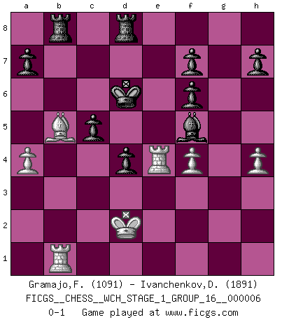 Last move : 0-1 2009 March 21 3:1:46 [Event "FICGS__CHESS__WCH_STAGE_1_GROUP_16__000006"] [Site "FICGS"] [Date "2009.02.22"] [Round "1"] [White "Gramajo,Francisco"] [Black "Ivanchenkov,Denis"] [Result "0-1"] [WhiteElo "1091"] [BlackElo "1891"] 1.d4 Nf6 2.d5 c6 3.dxc6 Nxc6 4.Nc3 d5 5.Nf3 Bg4 6.Nd4 e6 7.h3 Bh5 8.a3 Bg6 9.Bg5 Be7 10.Nxc6 bxc6 11.b4 d4 12.Na4 e5 13.Nc5 Bxc5 14.bxc5 Qa5+ 15.Bd2 Qxc5 16.e3 Qxc2 17.exd4 Qxd1+ 18.Rxd1 exd4 19.Bg5 c5 20.Bxf6 gxf6 21.Bb5+ Ke7 22.Kd2 Rab8 23.a4 Kd6 24.g4 Be4 25.Rhe1 Bg2 26.h4 Bf3 27.Rc1 Bxg4 28.Re4 Be6 29.f4 Rhd8 30.Rf1 Bd7 31.Rb1 Bf5 0-1 Queen's pawn game Player Black won this chess game. Follow this game move after move (download)At this time Fischer is simply a level above all the best Chessplayers in the world. (John Jacobs) Obwohl ich vom Stil her kaum zu den Priestern der Schachkunst gezählt werde, halte ich Schach doch für eine Kunst. (Tigran Petrosjan) El poder defensivo de una pieza clavada, solamente es imaginario. (Aaron Nimzovich) Le système Elo représente seulement une moyenne. Il est simplement un indicateur de votre stabilité. (Anatoli Karpov) When you stop learning you start dying. (Scott Adams)