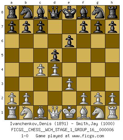 Last move : 1-0 2009 March 27 12:8:16 [Event "FICGS__CHESS__WCH_STAGE_1_GROUP_16__000006"] [Site "FICGS"] [Date "2009.02.22"] [Round "1"] [White "Ivanchenkov,Denis"] [Black "Smith,Jay"] [Result "1-0"] [WhiteElo "1891"] [BlackElo "1000"] 1.d4 d5 2.c4 e6 3.e3 1-0 This chess game has been lost on time (started : 2009.02.22 16:46:34) Queen's gambit declined Player White won this chess game. Follow this game move after move (download)It is not enough to be a good player... you must also play well. (Siegbert Tarrasch) Es ist schade, dass viele Schachsportler vergessen, wie wichtig Auftreten und angemessene Kleidung sind. (Alexandra Kosteniuk) Tu eres para mi la Reina en d8 y yo soy el Peón en d7!!. (GM Eduard Gufeld) Ce qui est bien, c'est d'avoir tout un tas de pièces en prise : l'adversaire ne peut en prendre qu'une à la fois. Cité par Thierry Audin. In God we trust, all others we virus scan. (Anonymous)