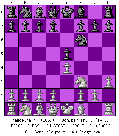 Last move : 1-0 2009 March 28 12:18:19 [Event "FICGS__CHESS__WCH_STAGE_1_GROUP_16__000006"] [Site "FICGS"] [Date "2009.02.22"] [Round "1"] [White "Mascetra,Nicola"] [Black "Ochupinkin,Teodor"] [Result "1-0"] [WhiteElo "1859"] [BlackElo "1400"] 1.e4 e5 2.h3 Nf6 3.Nf3 1-0 This chess game has been lost on time (started : 2009.02.22 16:46:34) King's pawn game Player White won this chess game. Follow this game move after move (download)If cunning alone were needed to excel, women would be the best Chess players. (Albin) Ich verstehe Aljechins Kombinationen ganz gut; aber woher er diese Angriffschancen bekommt und wie er die Eröffnung behandelt das ist für mich ein Buch mit sieben Siegeln. (Rudolf Spielmann) El Ajedrez es un juego terrible. Si no dominas el centro, tu oponente tiene una posición mas libre. Si tu tienes el centro, entonces realmente tienes algo de que preocuparte. (Siegbert Tarrasch) Les échecs sont un jeu par leur forme, un art par leur essence et une science par sa difficulté d'acquisition. Ils peuvent vous procurer autant de plaisir qu'un bon livre ou une belle musique, mais vous n'aurez une réelle joie que si vous arrivez à bien jouer. (Tigran Petrosian) Yoga is 99% practice and 1% knowledge. (Sri Krishna Pattabhi Jois)