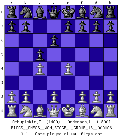 Last move : 0-1 2009 March 28 12:18:19 [Event "FICGS__CHESS__WCH_STAGE_1_GROUP_16__000006"] [Site "FICGS"] [Date "2009.02.22"] [Round "1"] [White "Ochupinkin,Teodor"] [Black "Anderson,Lawrence"] [Result "0-1"] [WhiteElo "1400"] [BlackElo "1800"] 1.e4 c5 2.c4 d6 0-1 This chess game has been lost on time (started : 2009.02.22 16:46:34) Sicilian defense Player Black won this chess game. Follow this game move after move (download)Chess is in its essence a game, in its form an art, and in its execution a science. (Baron Tassilo) Der Partner hat auch seine Existenzberechtigung. (Savielly Grigorievitsch Tartakower) Los finales de Peón son del Ajedrez lo que el cesped es del Golf. (Cecil Purdy) Le jeu d'échecs fait naître et fortifie en nous plusieurs qualités précieuses dans le cours de l'existence, telles que la prévoyance, la circonspection, la prudence, et la persévérance. (Benjamin Franklin - 1783, la morale des échecs) Kids, you tried your best and you failed miserably. The lesson is, never try. (Simpsons)
