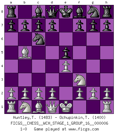 Last move : 1-0 2009 March 27 12:8:16 [Event "FICGS__CHESS__WCH_STAGE_1_GROUP_16__000006"] [Site "FICGS"] [Date "2009.02.22"] [Round "1"] [White "Huntley,Theron"] [Black "Ochupinkin,Teodor"] [Result "1-0"] [WhiteElo "1483"] [BlackElo "1400"] 1.e4 e5 2.Nf3 Nc6 3.Bb5 1-0 This chess game has been lost on time (started : 2009.02.22 16:46:34) Ruy Lopez (Spanish Opening) Player White won this chess game. Follow this game move after move (download)A man that will take back a move at Chess will pick a pocket. (Richard Fenton) Die Leute spielen gegen mich seit 15 Jahren unter Ihren Möglichkeiten. (Robert James Fischer) Si no le temes a Spassky, entonces elimino el elemento del dinero. (Jim Slater) Même si vous avez un bon coup à faire, regardez toujours s'il n'y en a pas un qui lui soit préférable. (Pedro Damiano) Success without honor is an unseasoned dish; it will satisfy your hunger, but it won't taste good. (Joe Paterno)