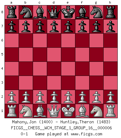 Last move : 0-1 2009 March 24 23:56:36 [Event "FICGS__CHESS__WCH_STAGE_1_GROUP_16__000006"] [Site "FICGS"] [Date "2009.02.22"] [Round "1"] [White "Mahony,Jon"] [Black "Huntley,Theron"] [Result "0-1"] [WhiteElo "1400"] [BlackElo "1483"] 0-1 This chess game has been lost on time (started : 2009.02.22 16:46:34) Player Black won this chess game. Follow this game move after move (download)We must make sure that Chess will not be like a dead language, very interesting, but for a very small group. (Sytze Faber) Im Wettkampf zwischen starken Meistern kommen Fehler sehr selten vor, deshalb ist es mit bloßem Warten nicht getan. (José Raúl Capablanca) Tu sabes, camarada Pachman, no disfruto el ser un Ministro, preferería jugar al Ajedrez como tu. (Che Guevara) Les écrivains ont utilisé les échecs pour analyser les côtés extrêmes de la nature humaine. Dans ce cadre, les échecs offrent un champ d'expérimentation idéal. Mais on pourrait faire la même chose avec la peinture. Et là, en vous référant à Van Gogh, vous ne tirerez pas de conclusion définitive sur les peintres. (Gary Kasparov) Chess, like love, like music, has the power to make people happy. (Siegbert Tarrasch)