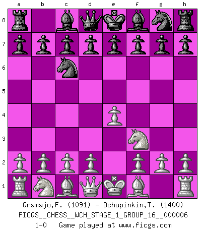 Last move : 1-0 2009 March 28 0:9:4 [Event "FICGS__CHESS__WCH_STAGE_1_GROUP_16__000006"] [Site "FICGS"] [Date "2009.02.22"] [Round "1"] [White "Gramajo,Francisco"] [Black "Ochupinkin,Teodor"] [Result "1-0"] [WhiteElo "1091"] [BlackElo "1400"] 1.Nf3 Nc6 2.e4 1-0 This chess game has been lost on time (started : 2009.02.22 16:46:34) Reti Opening Player White won this chess game. Follow this game move after move (download)A thorough understanding of the typical mating continuations makes the most complicated sacrificial combinations leading up to them not only not difficult, but almost a matter of course. (Siegbert Tarrasch) Der Knackpunkt bei der Konzentration ist, daß wir nur durch sie etwas Neues und Ungewöhnliches am Schachbrett finden können. Sie ist der einzige Weg durch neue neue Ideen eine Überraschung zu bereiten. (Garry Kasparov) Yo no creo en la psicología. Yo creo en las buenas movidas. (Bobby Fischer) Seul un grand joueur sait à quel point il joue faiblement. (Xavier Tartacover) I just play for fun. (Anna Kournikova)